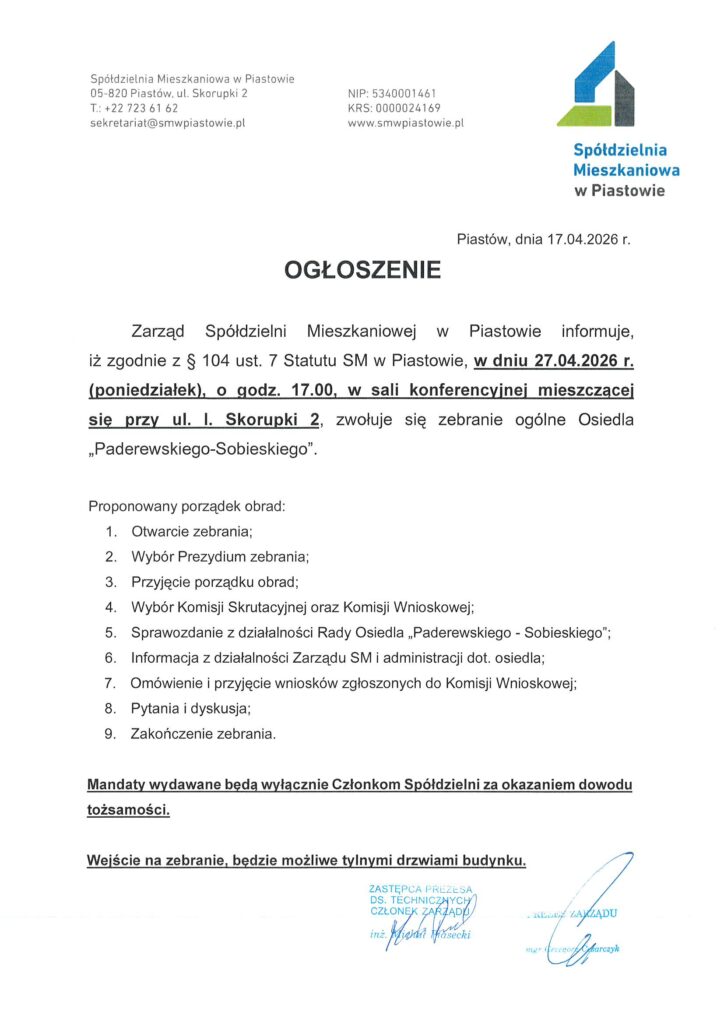 Zebranie Ogólne Osiedla „Paderewskiego – Sobieskiego”
